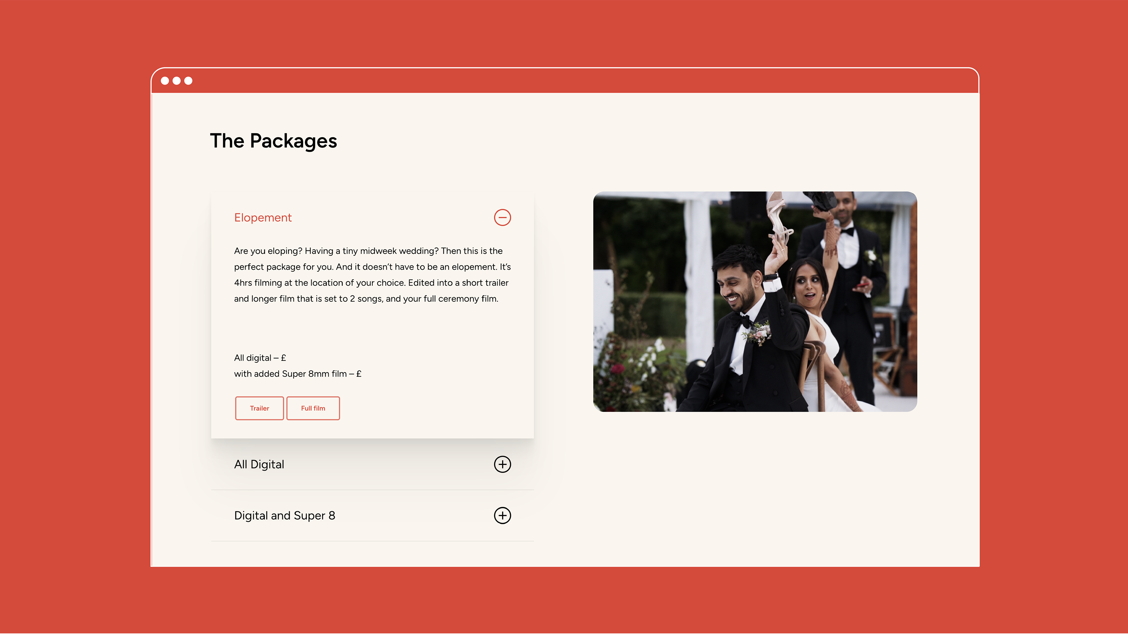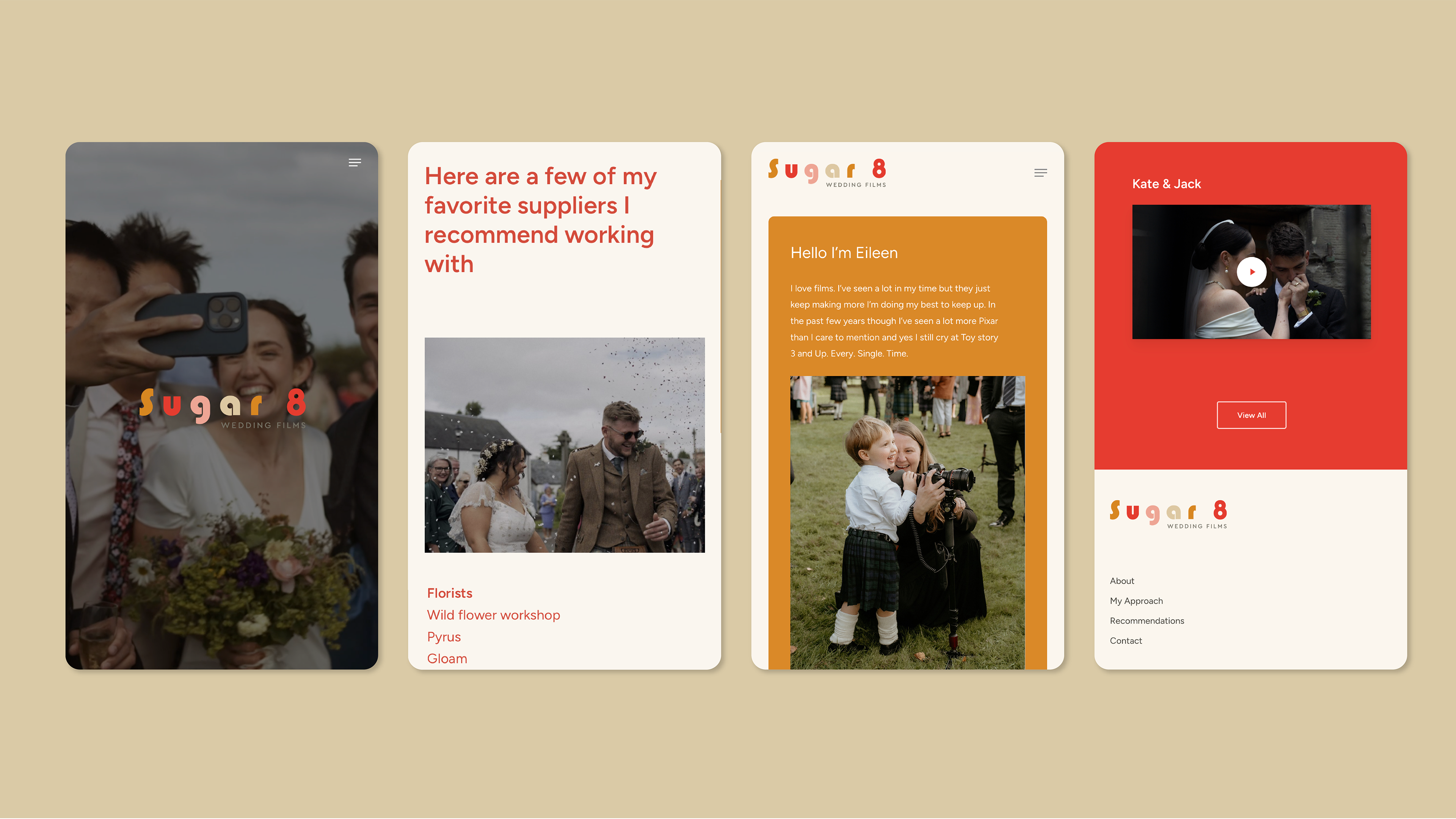 Sugar 8 is a vintage wedding videography company, specialising in handcrafted films shot on handheld cameras. I collaborated with Sugar 8 to redesign their existing website. Built on WordPress, the new site is fully responsive across all devices, with a clean, user-friendly interface that gives couples a true sense of Sugar8’s unique style and approach to filming weddings. A password-protected page now serves as an elegant online brochure for prospective clients, clearly outlining the available packages.